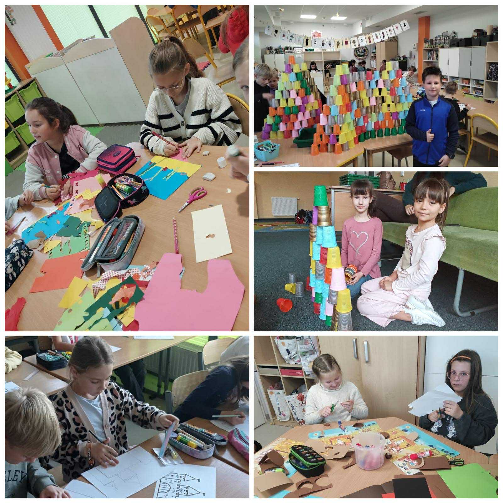 Następnie dzieci odkrywały ciekawe budowle z różnych zakątków świata, poznając ich historię, przeznaczenie i charakterystyczne cechy architektoniczne. Uczniowie z zapałem tworzyli własne konstrukcje z klocków, papieru i innych materiałów.