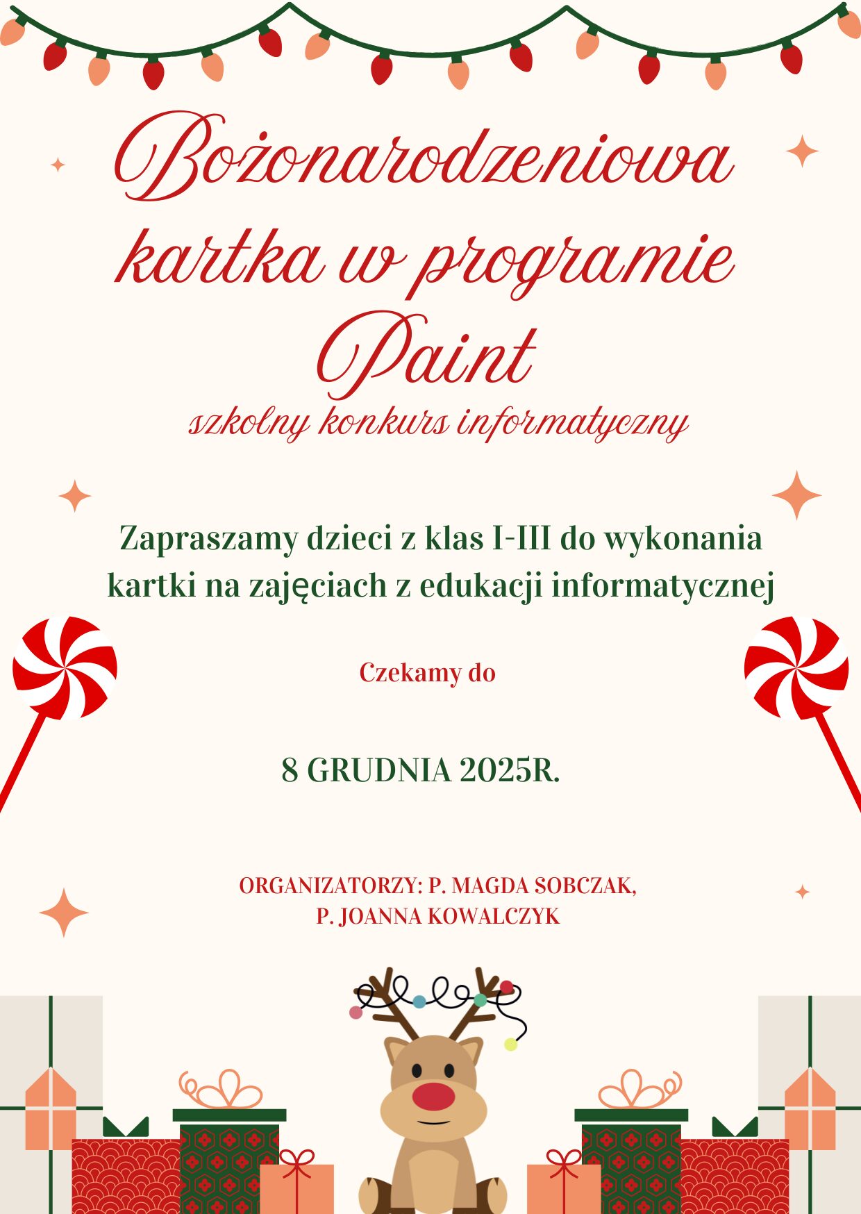 Bożonarodzeniowa kartka w programie Paint – konkurs informatyczny 13 listopada 2025 Udostępnij Wyślij za pomocą e-mail Szkolny konkurs informatyczny pt – regulamin Załączniki Szkolny konkurs informatyczny pt (113 kB)