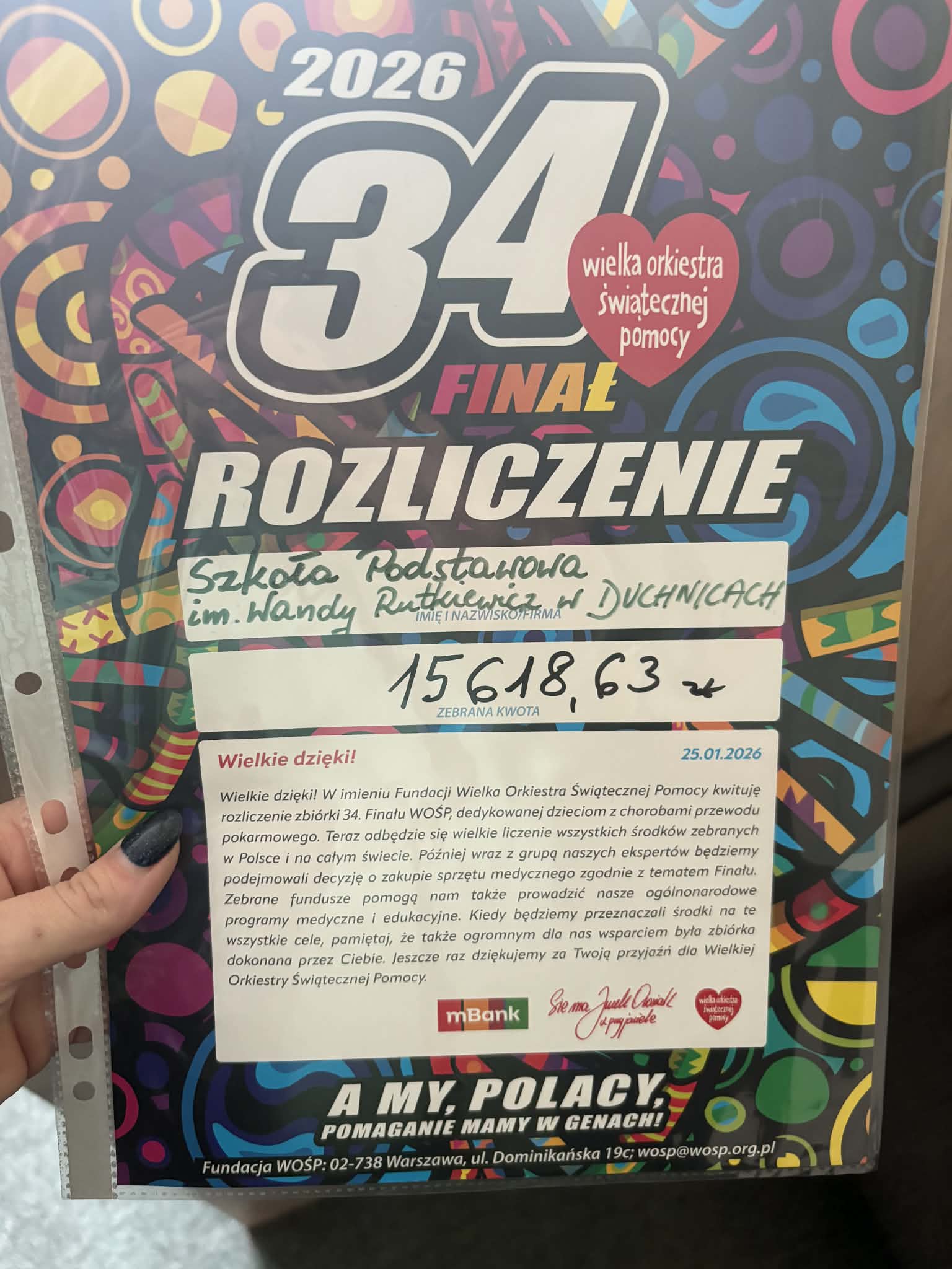 Wspólnymi siłami zasilamy fundację WOŚP kwotą 15618,63 zł Z tego miejsca chciałybyśmy bardzo podziękować całej społeczności SP Duchnice za zaangażowanie, za wszystkie gadżety i vouchery na licytację, loterię, a także ciasta. Szczególne podziękowania należą się Pani Katarzynie Rybakowskiej za obsługę techniczną naszego fanpage, uczniom 6b oraz Ignacemu z klas 7c, którzy w dniu dzisiejszym od wczesnych godzin porannych pomagali przy organizacji finału, rodzicom, a także nauczycielom! Bez Was to by się nie udało ![]()